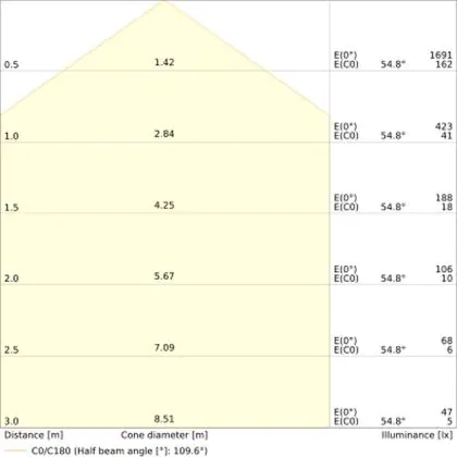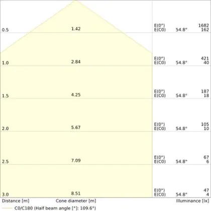 De lichtopbrengst (Lumen), geeft weer hoe krachtig het uitgestraalde licht is. Dit is belangrijk om te weten om de juiste sfeer te creëren. 0 tot 400 Lumen is bij uitstek geschikt voor accent- of sfeerverlichting. Een hoger aantal Lumen is, afhankelijk van de grootte van de ruimte, beter geschikt als ondersteunende- of basisverlichting. Heb je plafonds hoger dan 4 meter, dan is een lichtopbrengst van minimaal 8000lm aan te raden indien heldere verliching gewenst is (vb. in werkomgevingen).